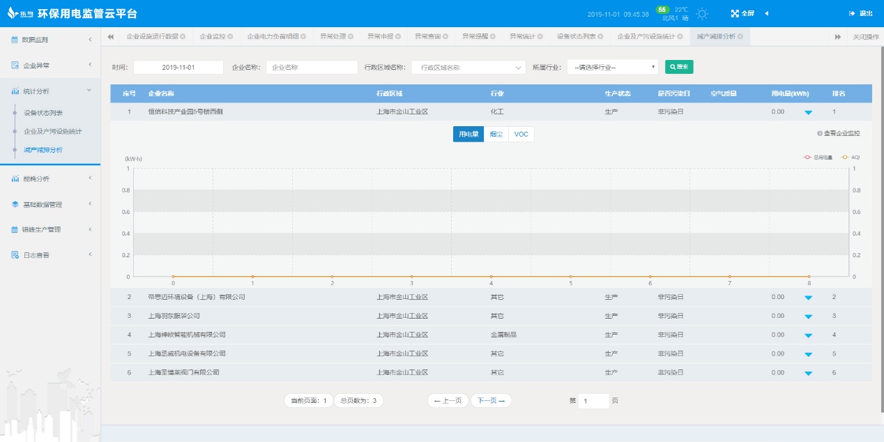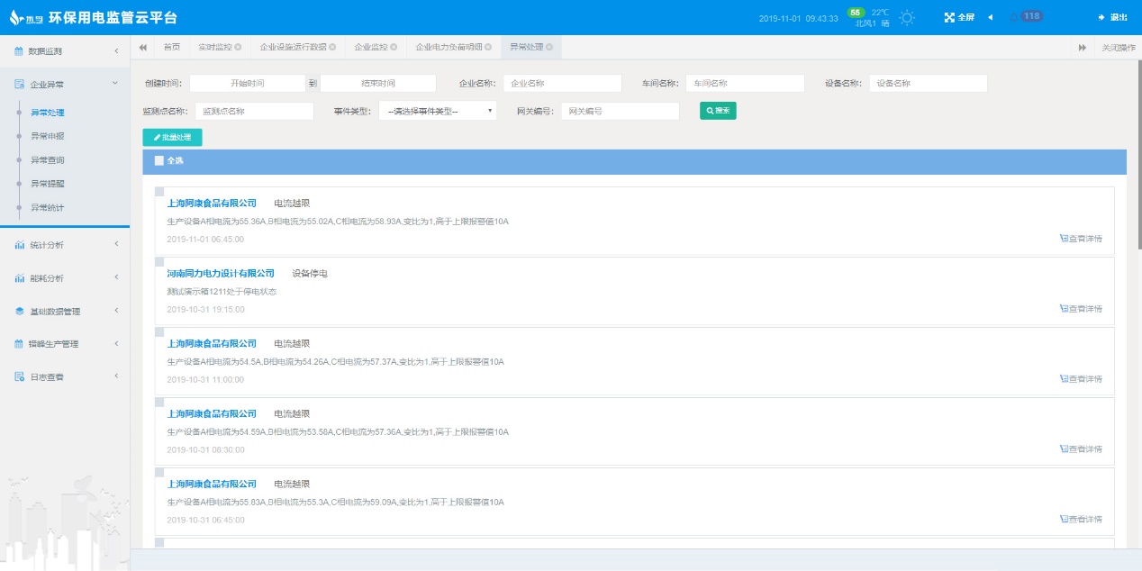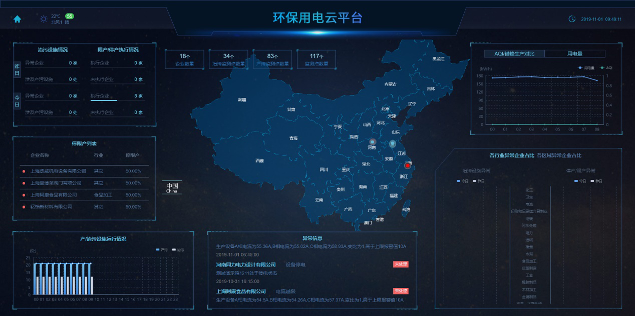 系统实时采集企业总用电、生产设备及环保治理设备用电数据,通过关联分析、超限分析、停电分析、停限产分析,及时发现环保治理设备未开启、异常关闭及减速、空转、降频等异常情况,同时通过数据分析还可以实时监控限产和停产整治企业运行状态。