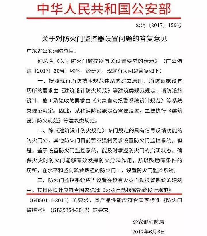 根据这个国家标准,所有安装了防火门的建筑必须安装防火门监控系统(含自动闭门器),以保证防火门的正常使用。同时在发生火灾等突发状况时,防火门能够起到防火,隔烟,隔火的作用,保证楼梯等逃生通道的畅通,保护人们安全离开。应安装防火门闭门器,顺位器等。