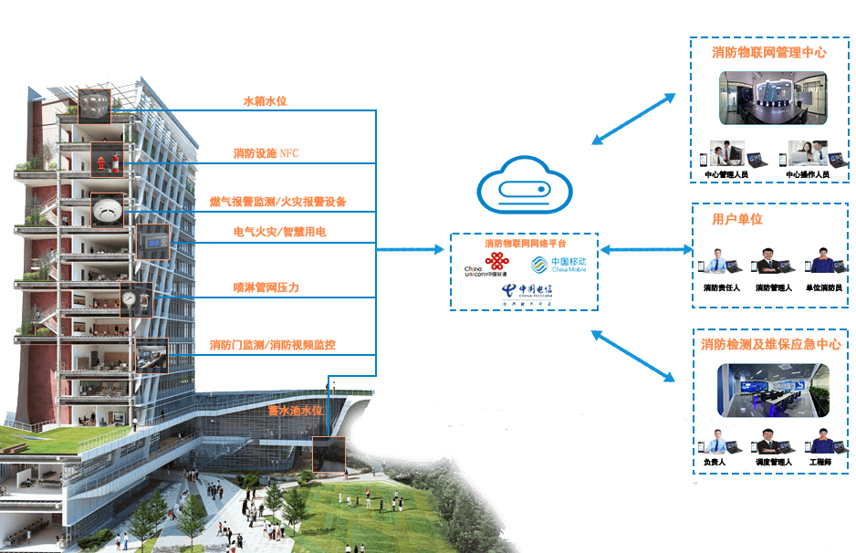 “智慧消防”通过⼈防+技防帮助实现社会化消防管理模式,强化落实主体责任制,通过云平台系统应用,实时掌握各地区消防⼯作现状,分析本地区消防安全形势,开展有针对性的专项整治⼯作,以及市政消⽕栓⽔源建设情况,帮助落实政府领导职责。