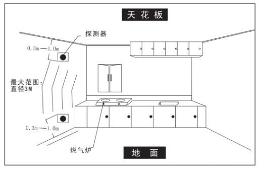探测比空气轻的气体时:安装于低于天花板0.3-1.0米,距气源半径1.5米内;