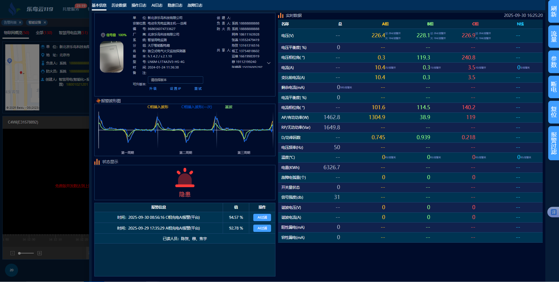 采集电压、电流、功率因数、谐波含量、三相不平衡度、频率偏差等共计超过20项电气参数,通过电流指纹识别技术,对电动车充电的场景进行实时监控,识别到电动车充电时进行报警。