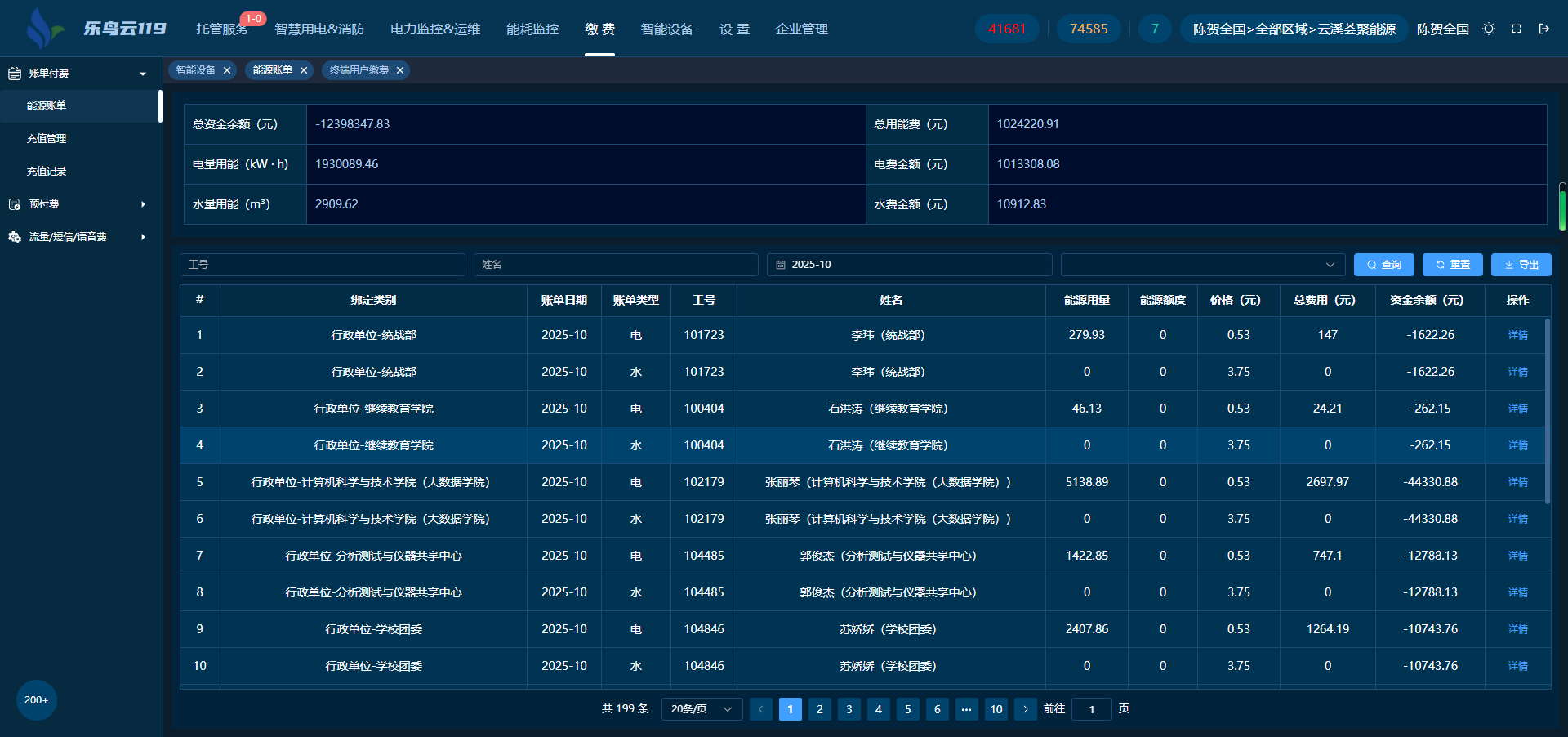 根据用户和能源类型(如水、电等)自动生成月度账单,详细列出用电量、用水量、能源单价及总费用。