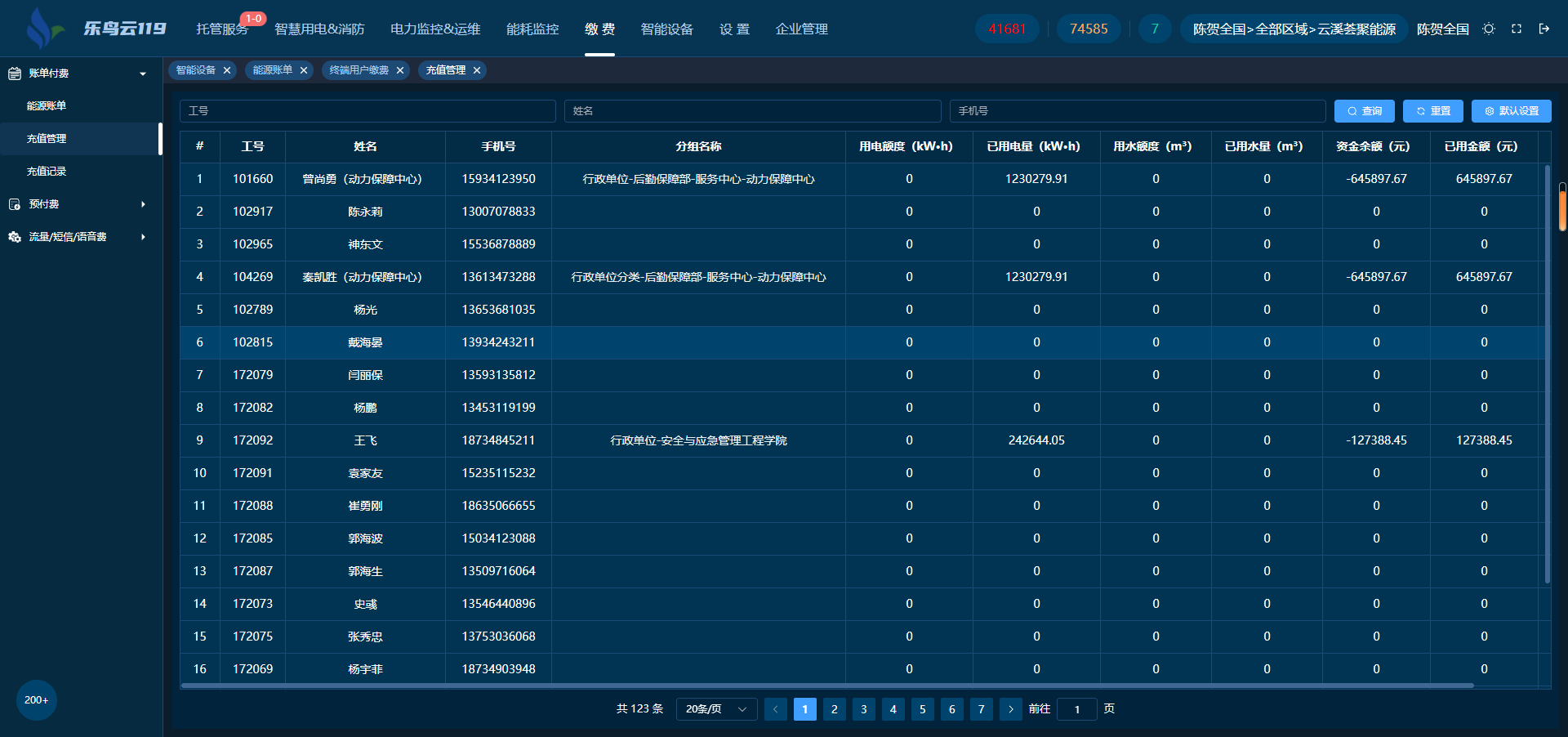 用户可查看和管理能源额度(如用电额度、用水额度)及资金余额,支持充值操作以增加额度或余额。