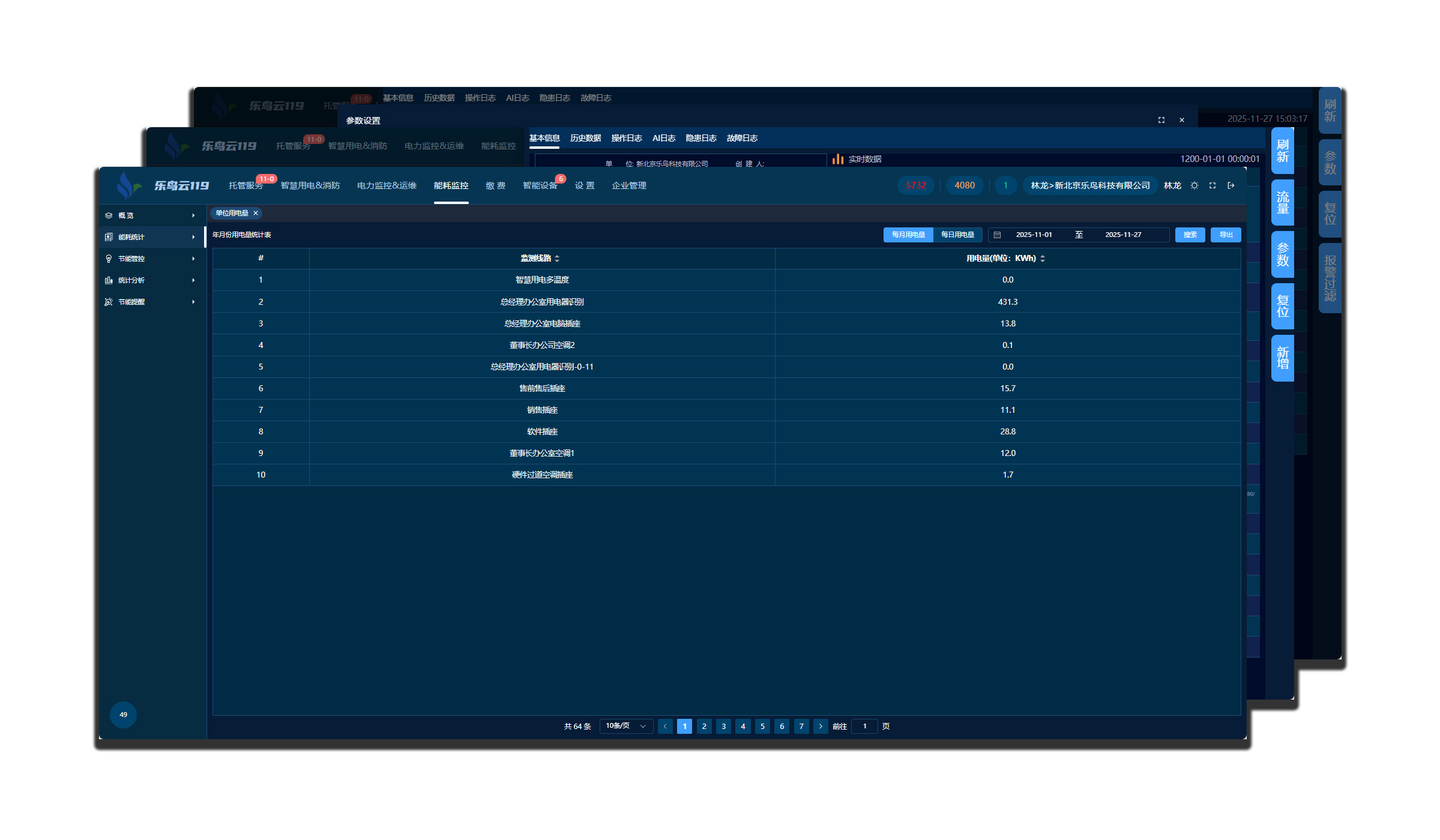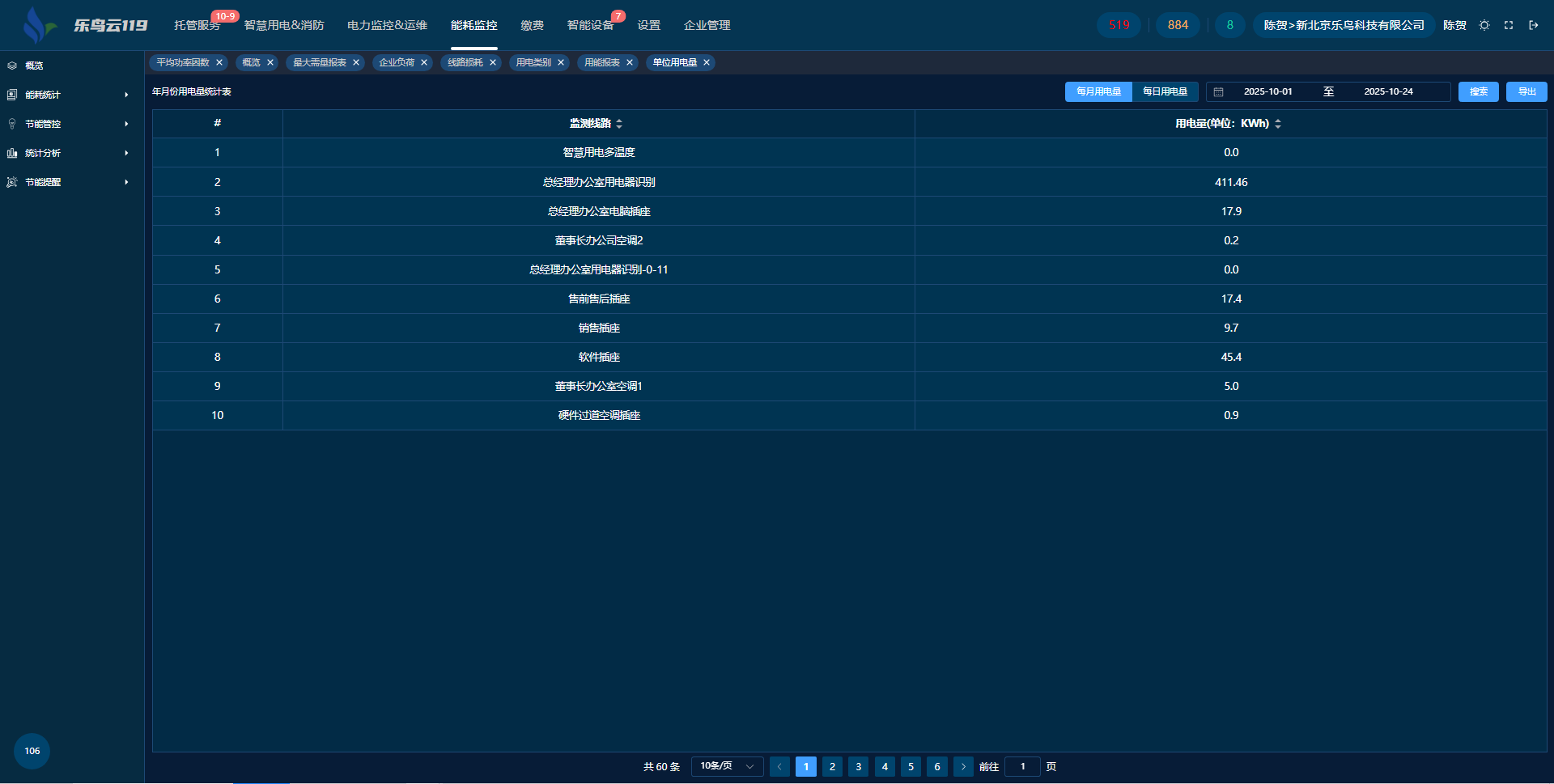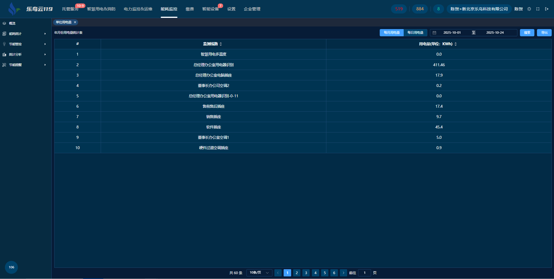 按月查询设备用电情况,提供每日用电明细及月度用电总量统计,并支持数据导出功能。