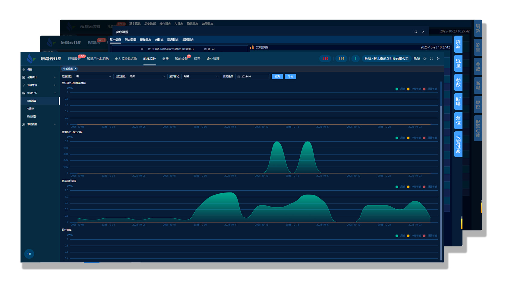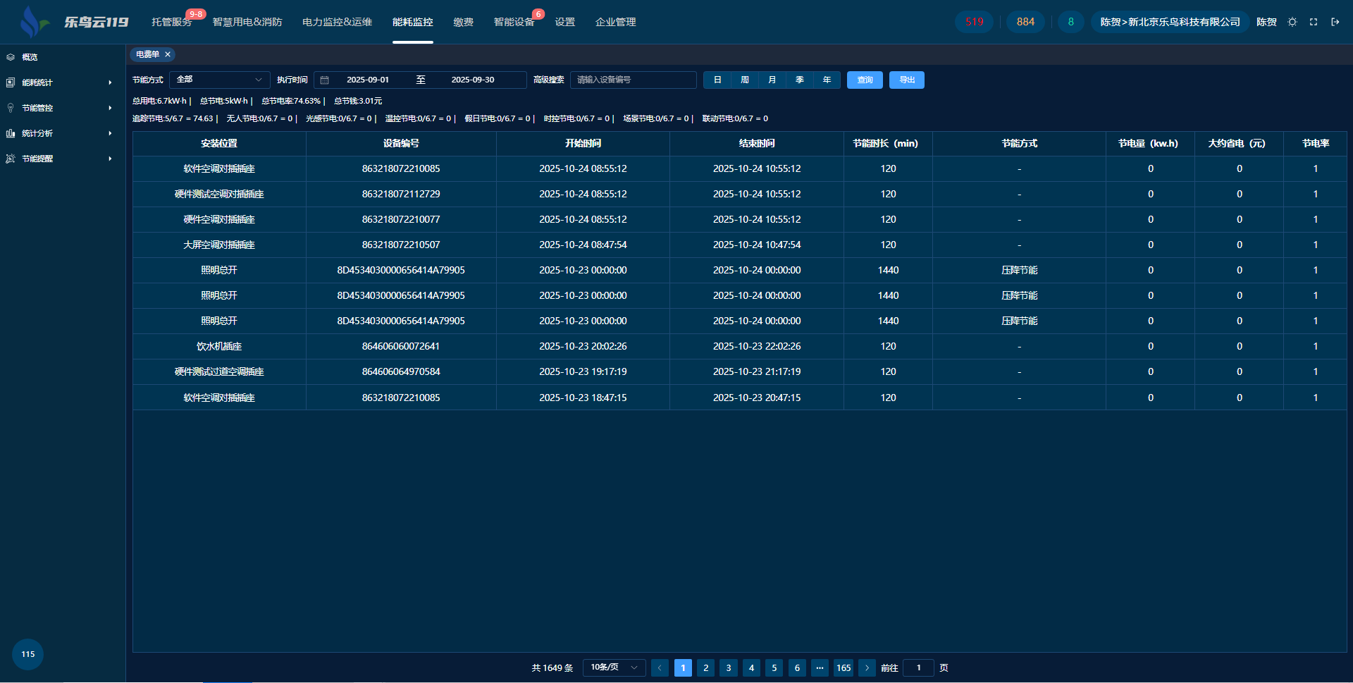 通过节能模式进行筛选,并根据执行时间、设备编号按日、周、月、季、年进行查询,同时支持数据导出。