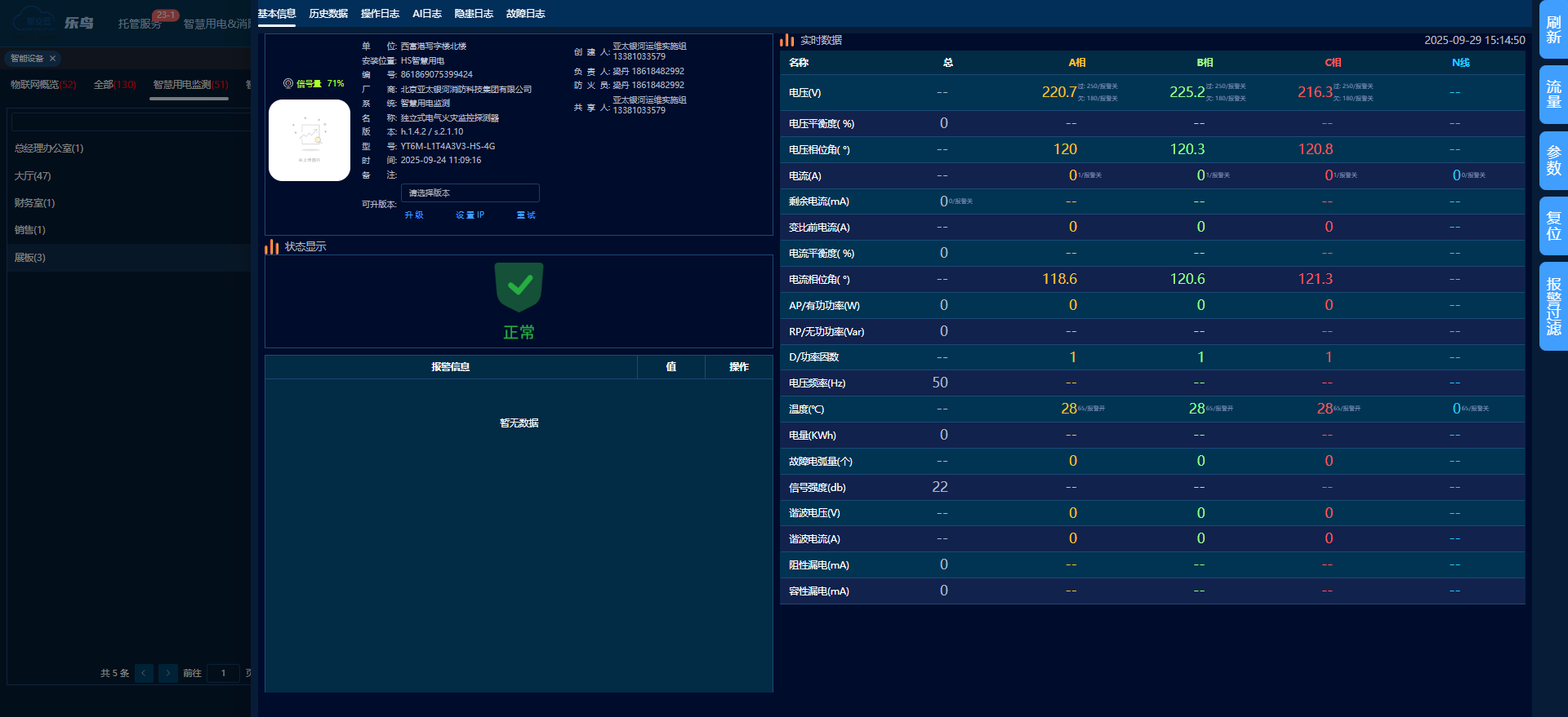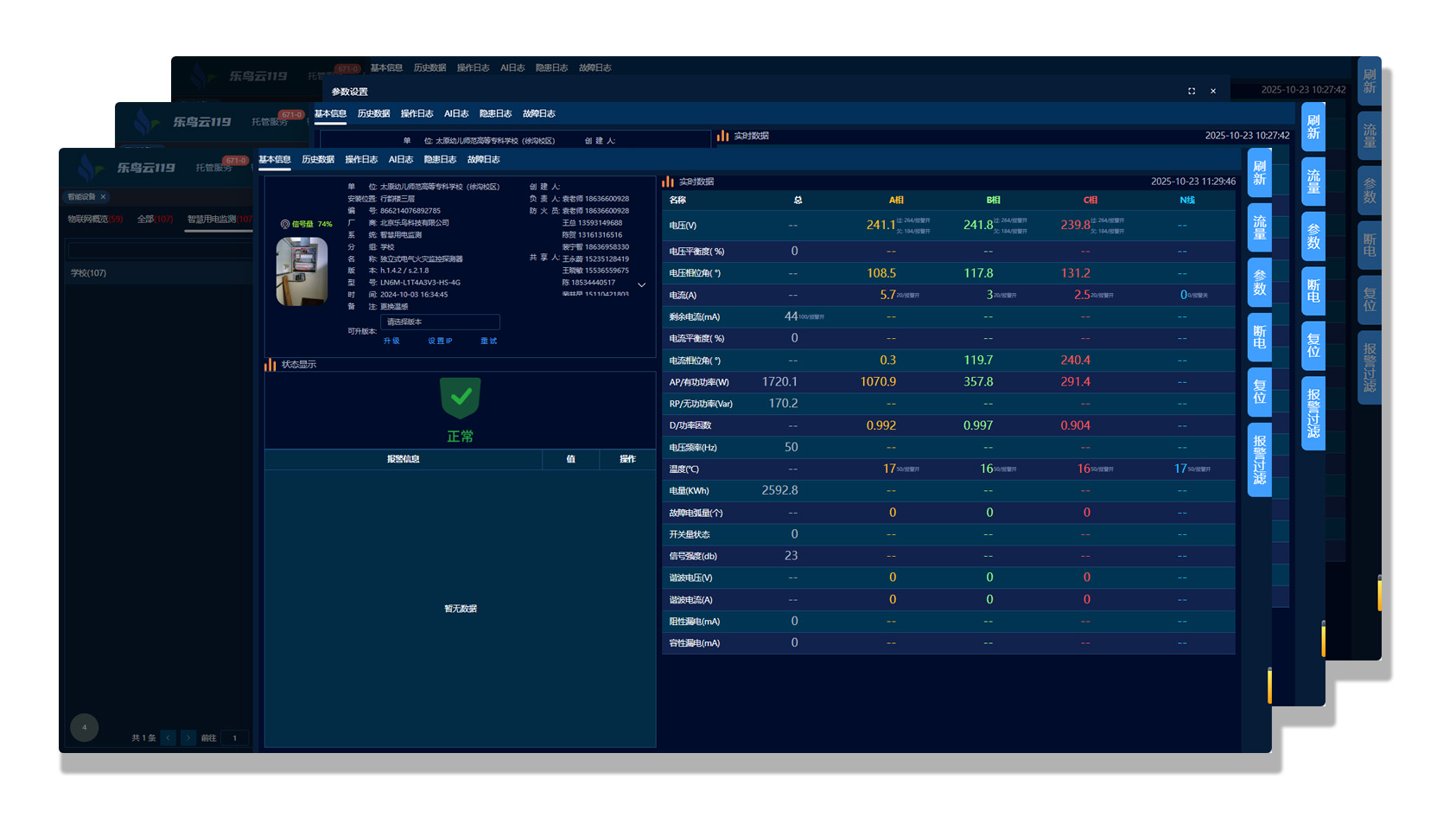 页面呈现设备全部信息,涵盖项目基础资料、安装位置、参数实时值、参数变化曲线及参数配置等内容。支持对设备执行刷新、调参、复位操作,并能对设备报警信息进行过滤处理。
