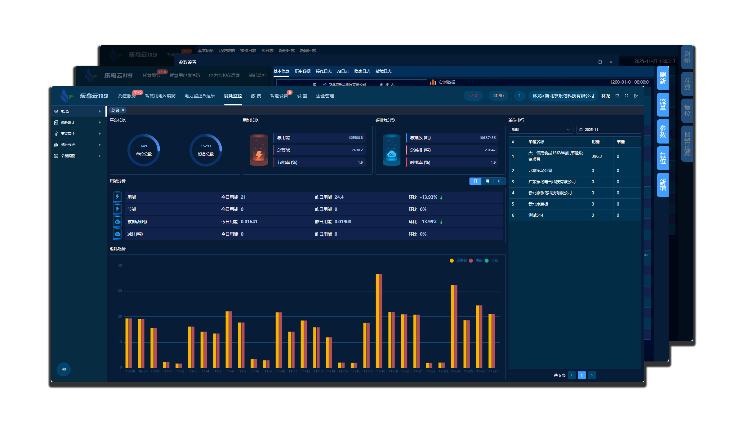 对单位的节能信息进行展示,对用能、碳排放数据总量统计并分析,按每日用能、节能生成图表分析能耗趋势。按单位进行节能排行,点击单位可查看单位节能管控信息,点击用能设备查看节能设备的实时数据、用能数据、历史记录和历史数据。