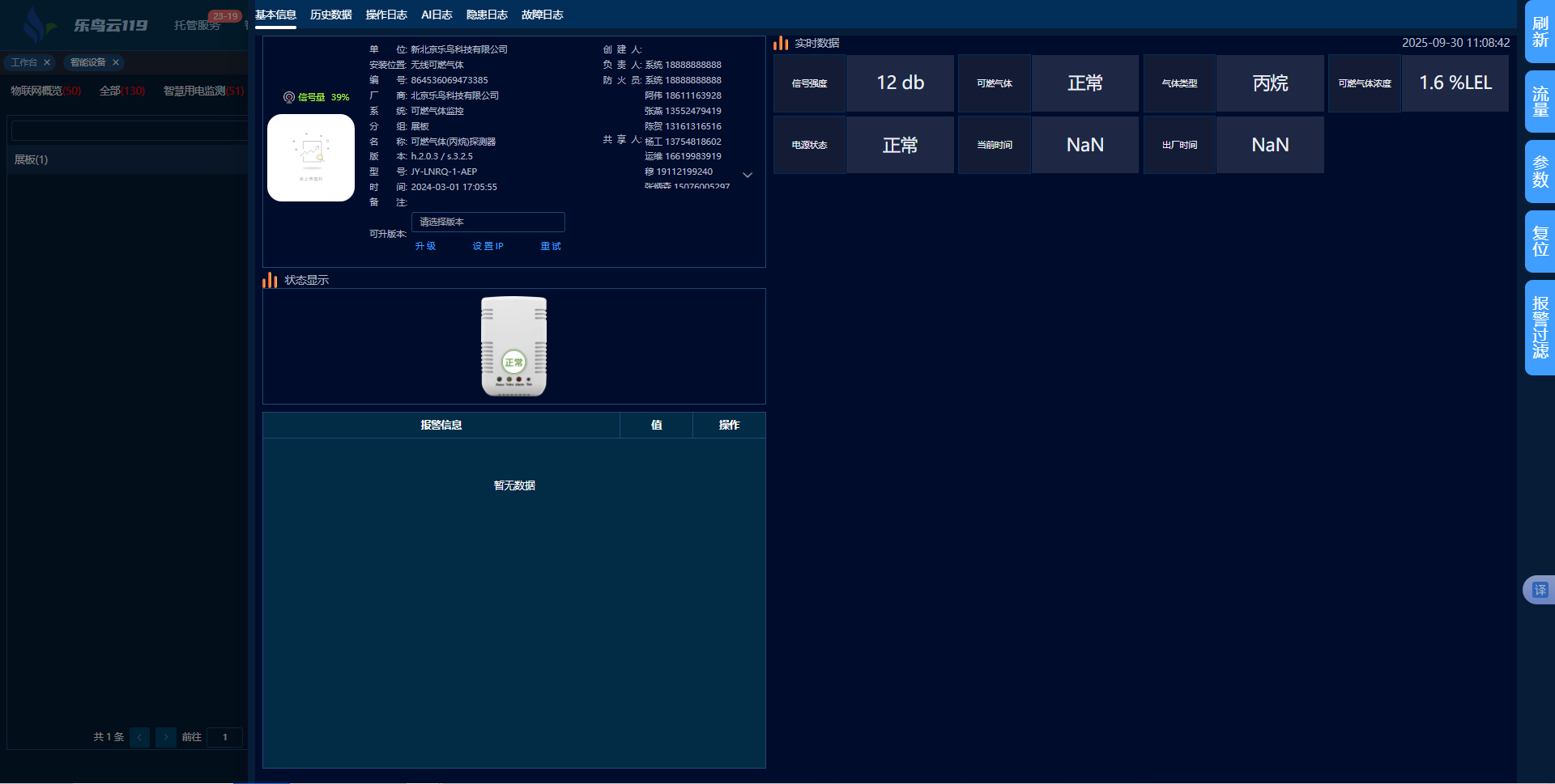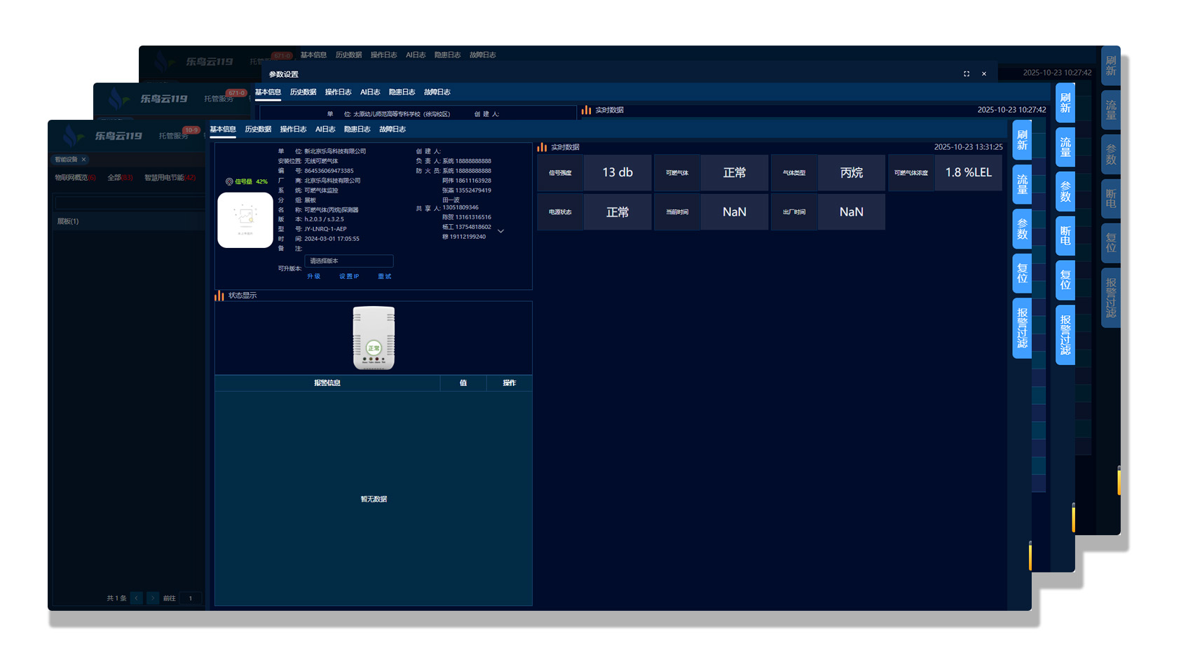 查看实时监测数据,涵盖气体浓度值、设备状态设备位置等信息。