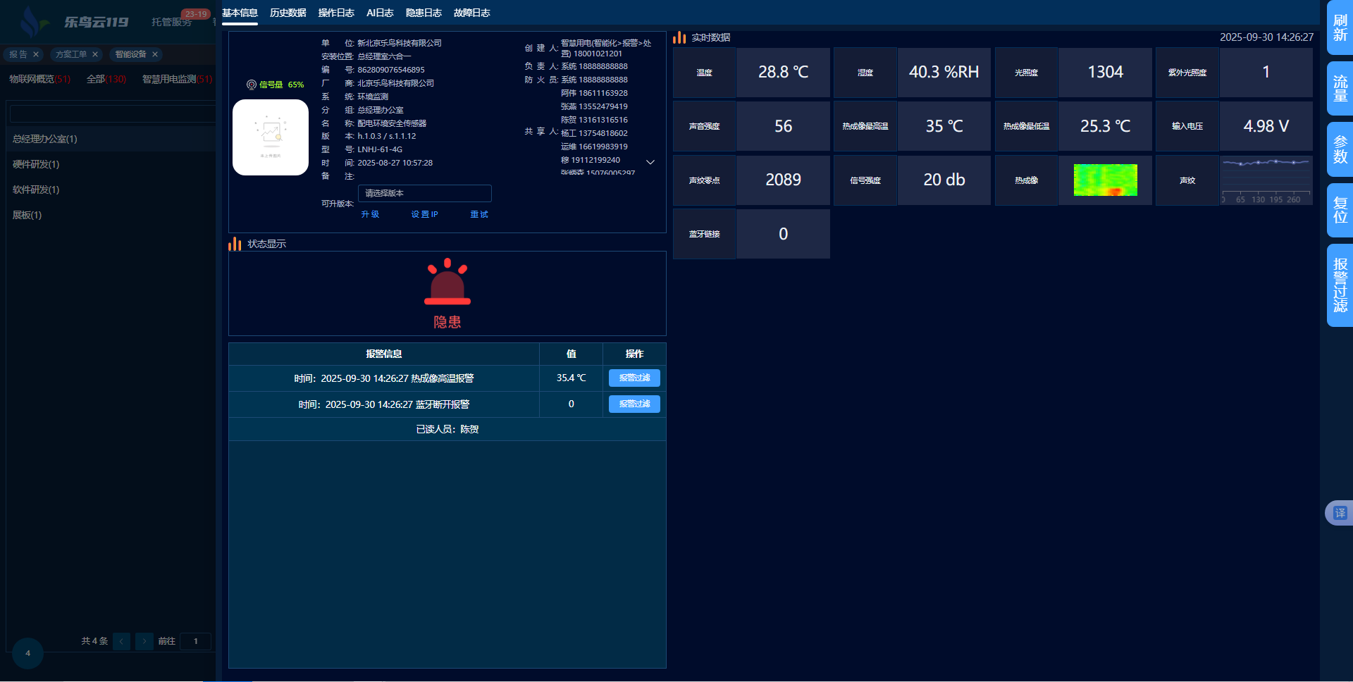 平台实时同步温度、湿度、光感、热成像及声纹等数据,查看历史数据曲线与实时监测值。