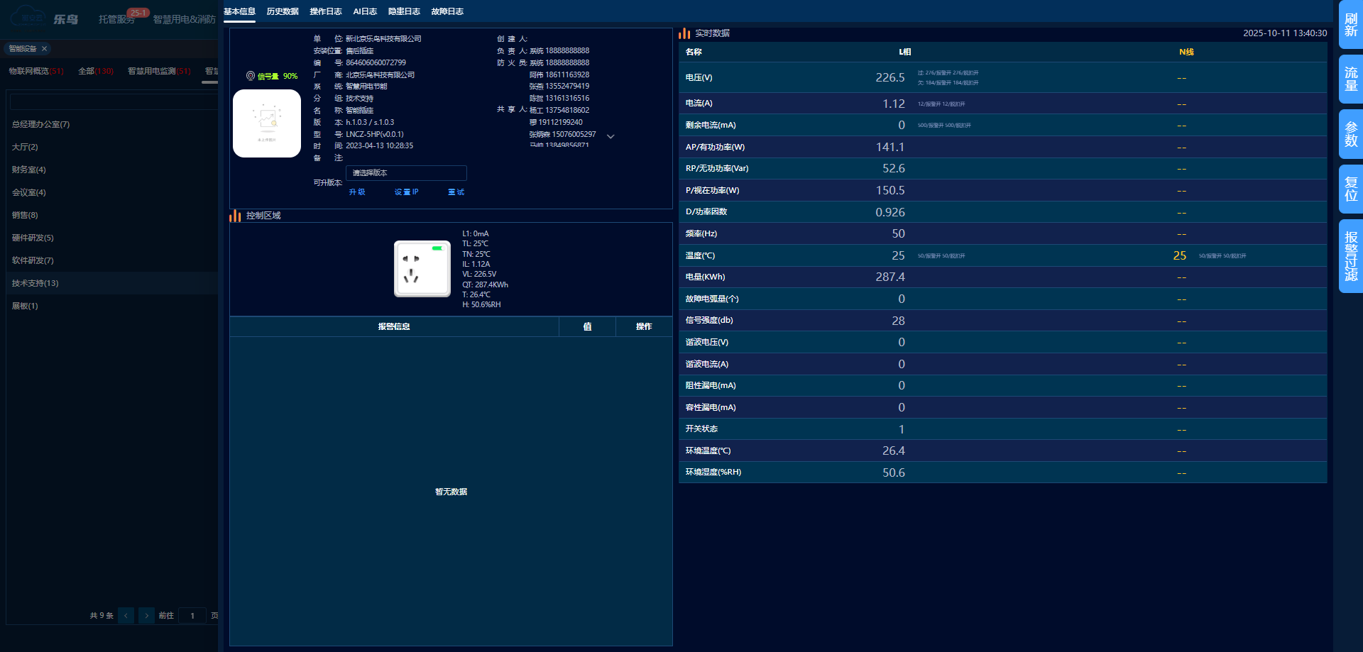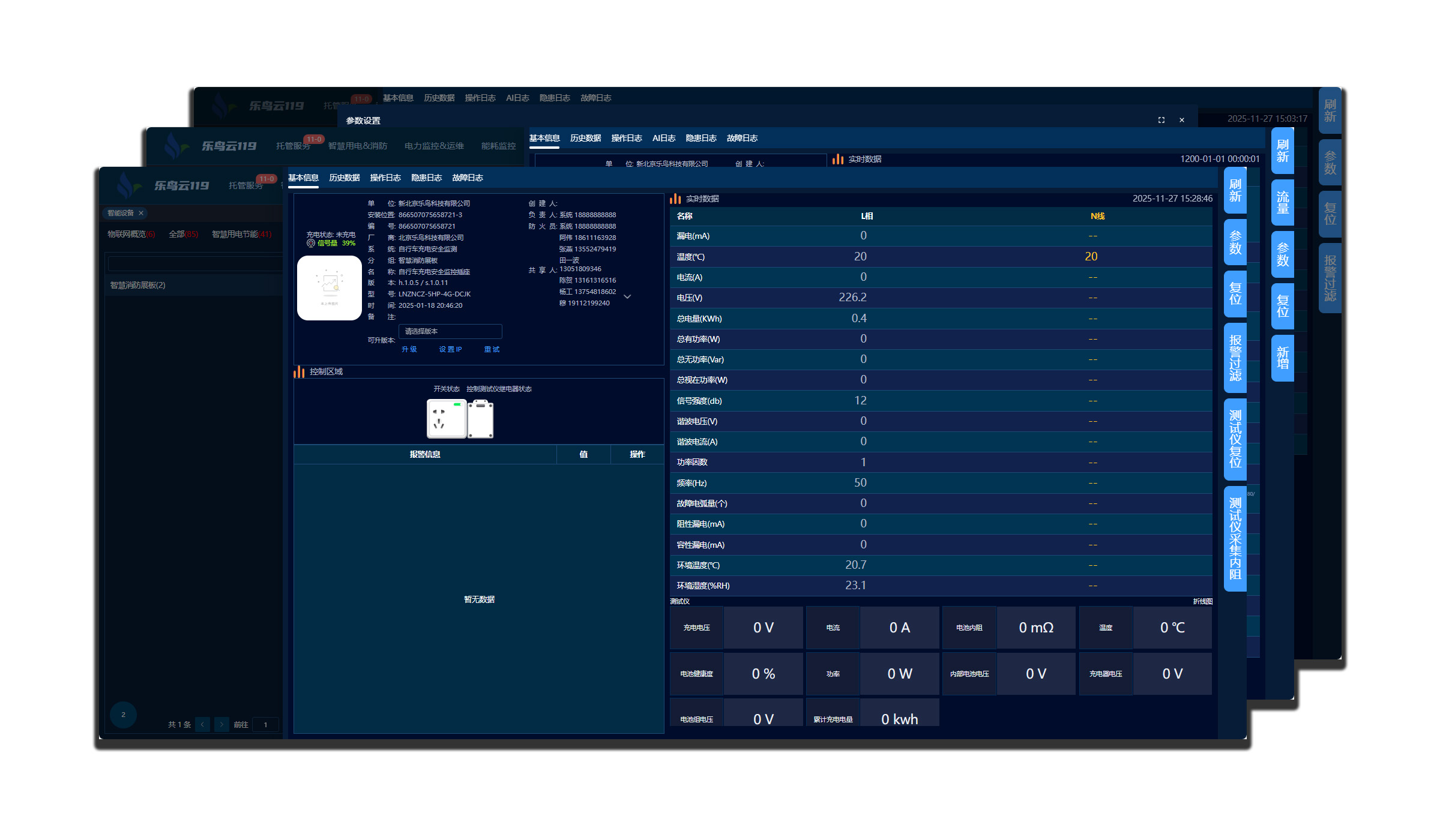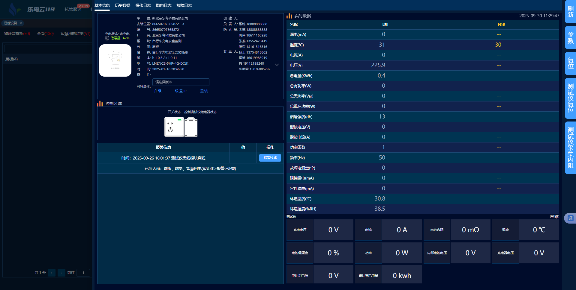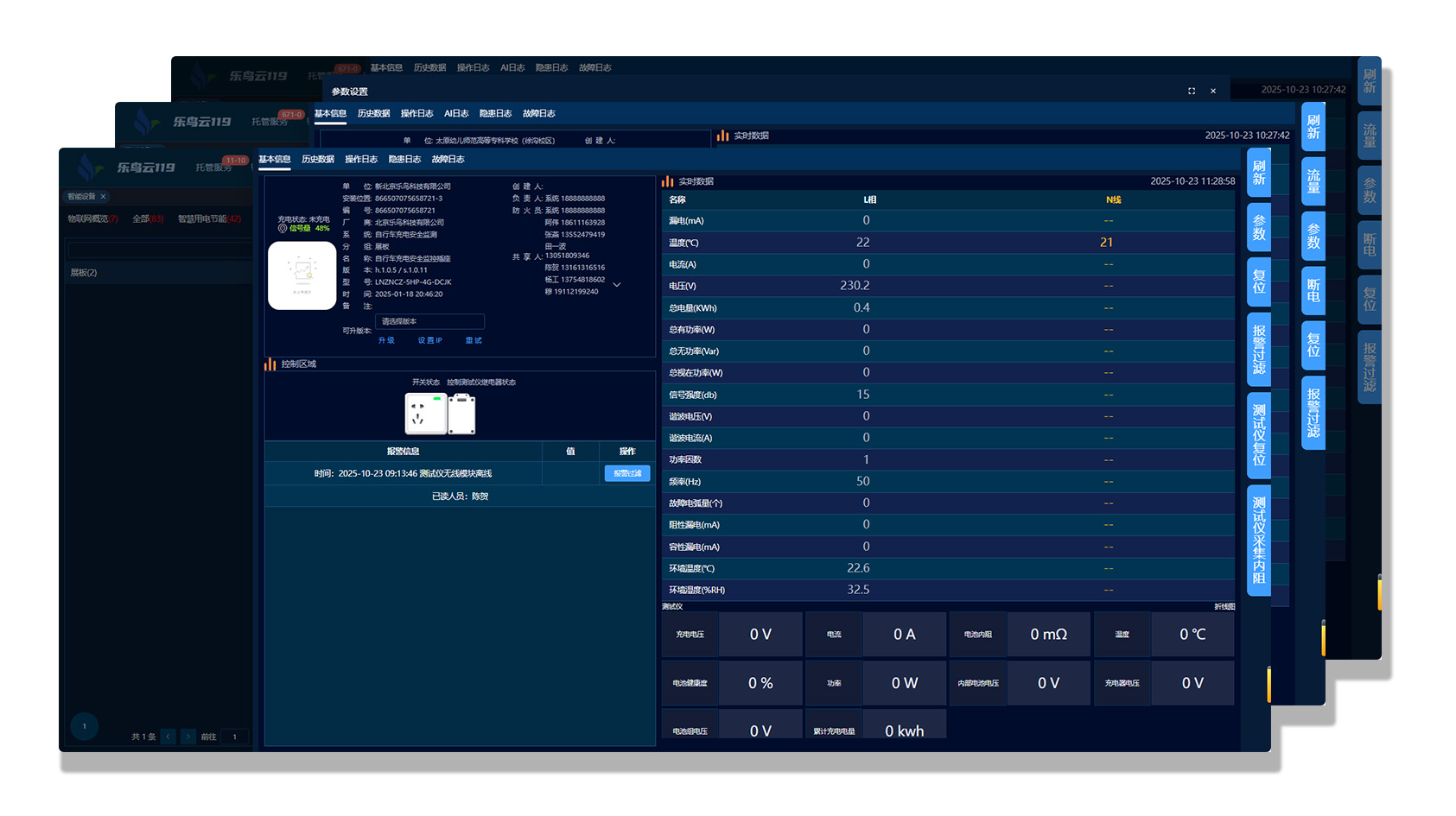 监测电动车充电器状态以及电瓶状态,查看线路的漏电报警、线路温度、功率限制等数据。查看电池的健康度监测、线路温度、电流波动报警、电流报警等数据。
