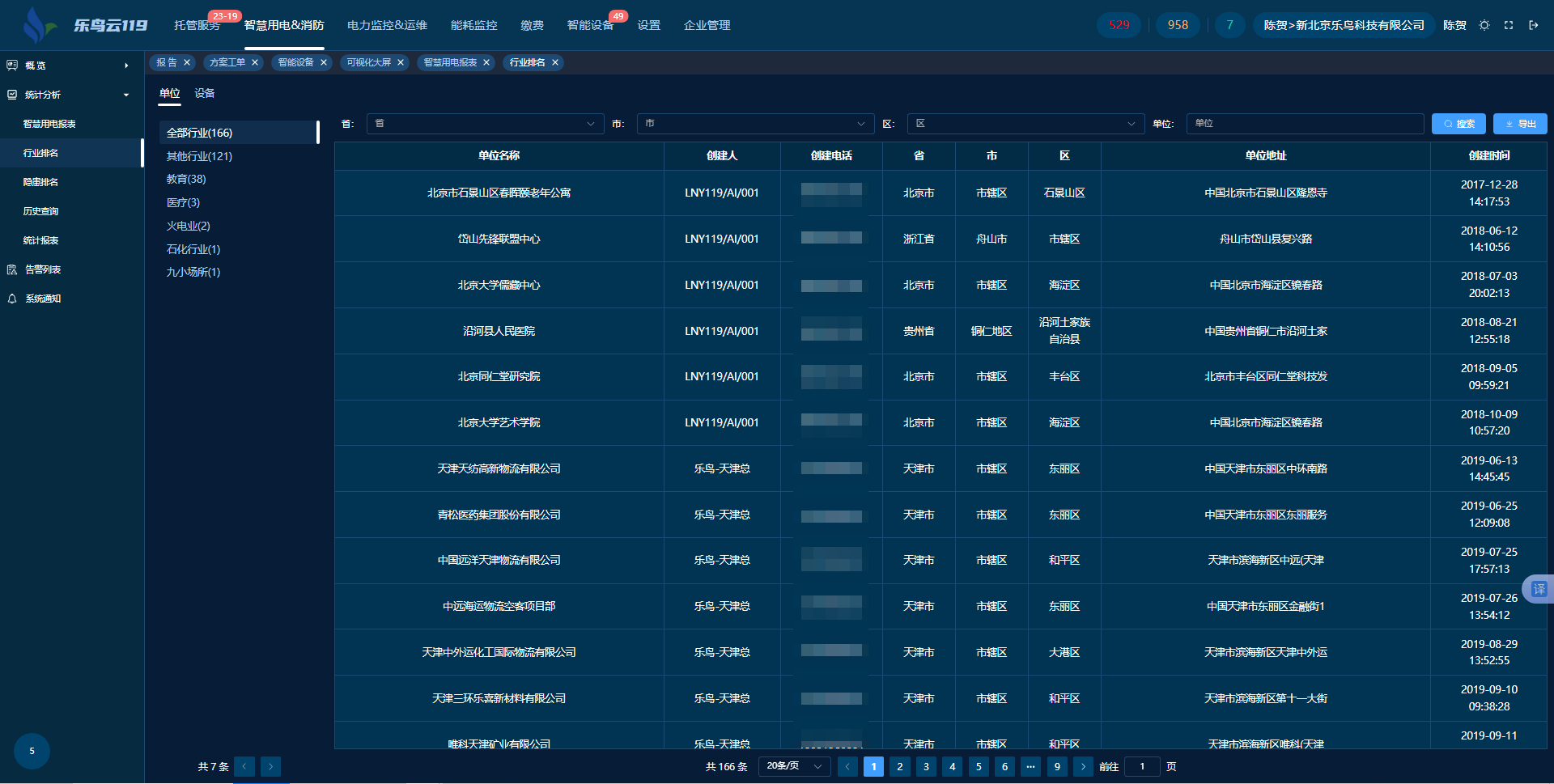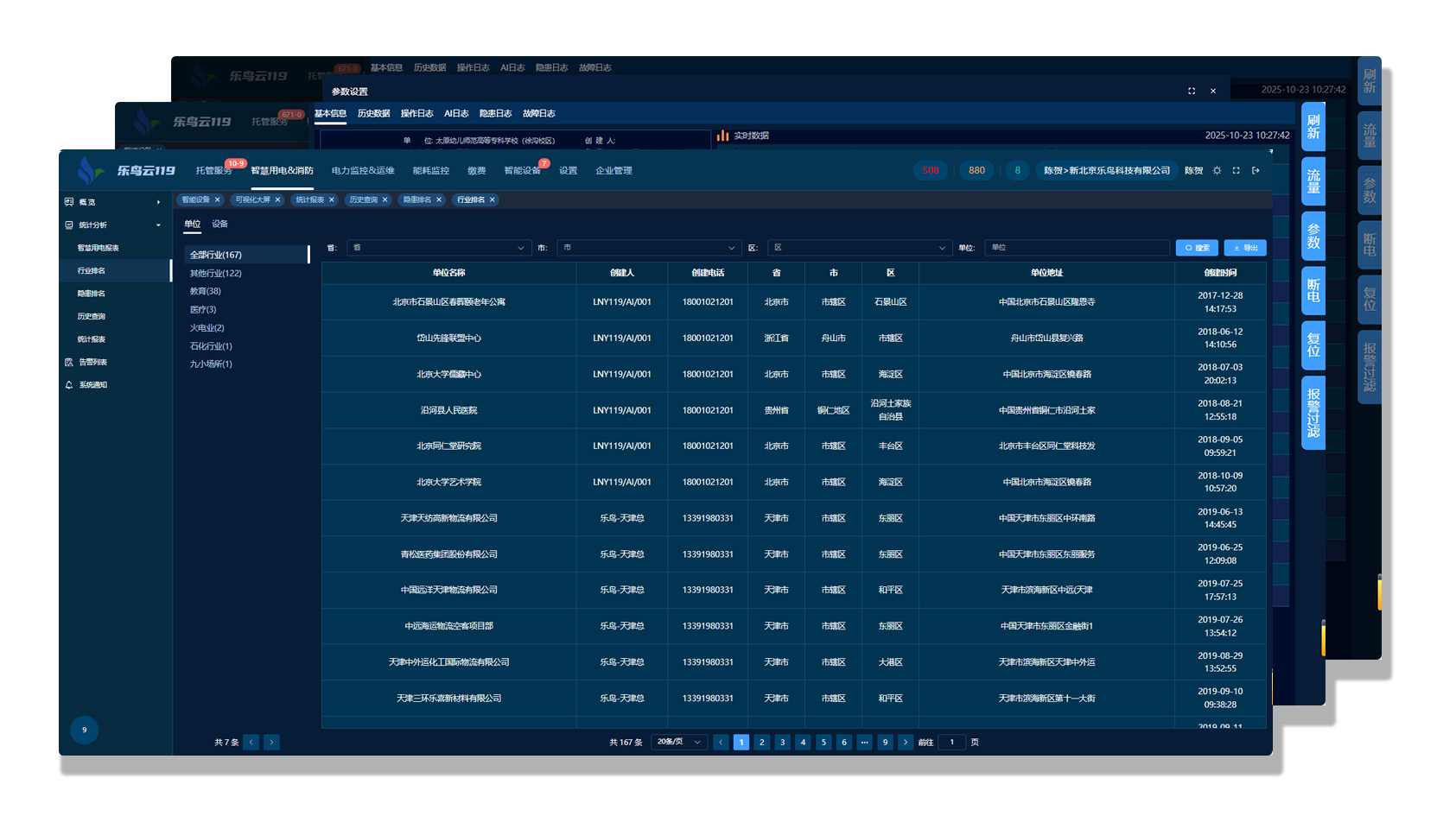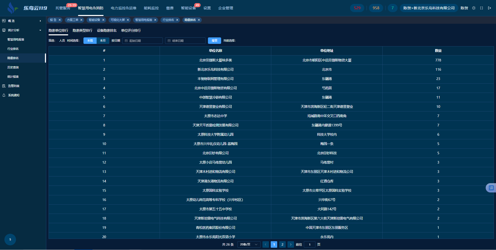 统计分析系统构建多维度排名体系(涵盖单位报警频率、隐患类型、设备隐患、单位评分等),实现风险可视化。系统支持按故障、隐患等类别分类查询历史数据,自动生成周/月/季/年性能耗用报表。所有数据(含硬件状态、位置、报警记录等)可导出,为决策提供依据。