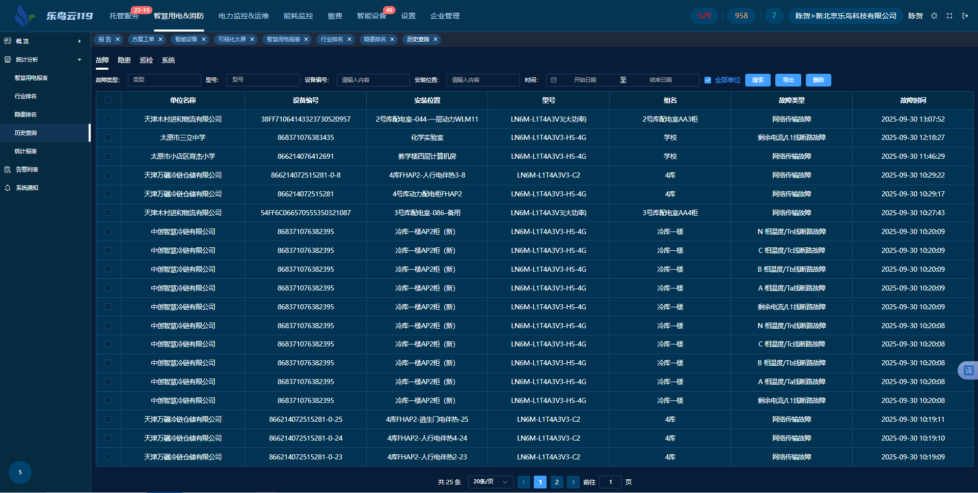 历史查询中有故障、隐患、巡检、系统四个标签,可以筛选条件分别对四个标签进行逐一查询统计,列表是按时间倒序进行排列查询的。