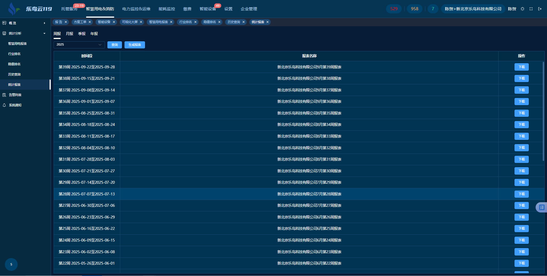 可以自动生成用电统计报表,支持以周报、月报、季报、年报为周期,生产后可下载至本地阅览。